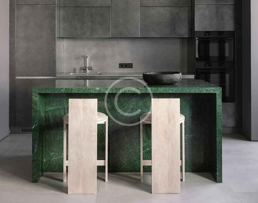 Green marble island blends luxury with minimalism in contemporary kitchen